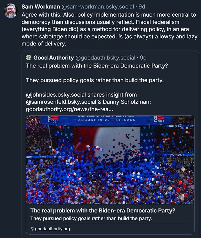The article above, from Good Authority, is an insightful read. It makes several points that I largely agree with. Democrats have been lax in both party building and establishing the "in-between" institutions that support the party—such as podcasts, alternative media, and grassroots organizations—for some time. This showed during the Biden administration, where the focus was squarely on policy, but lacked attention to the organizations and systems that help explain policy to key populations.